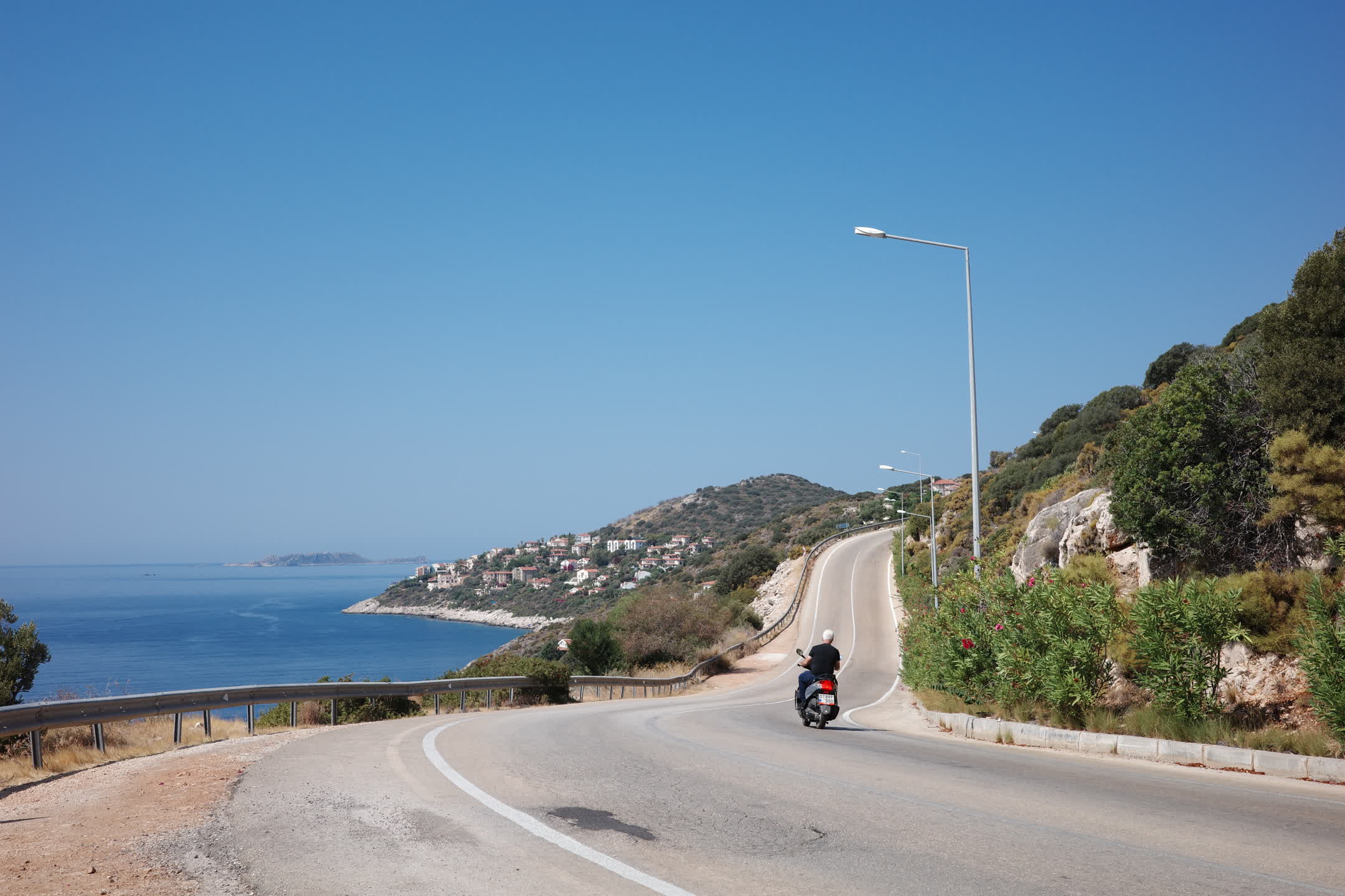 The sunlight was brilliant. Even with sunglasses on, which cast the mountains and sea under a dark translucent filter, everything still lay completely exposed under the fierce shine. I rode the little scooter we rented yesterday, cruising along the road. Pink flowers appeared now and then by the roadside, their color popping vividly against the gray-yellow vegetation. To the left were mountains—hotels and apartments nestled near the foothills. To the right, the sea—crowded beaches, umbrellas, people. The road ahead was playful, curving, weaving, at times neatly hidden behind the hills.