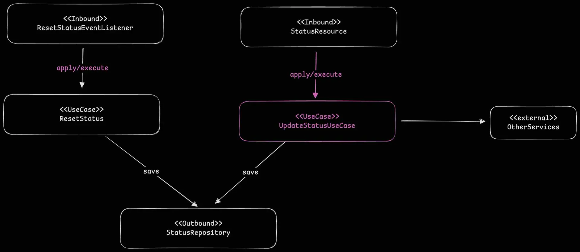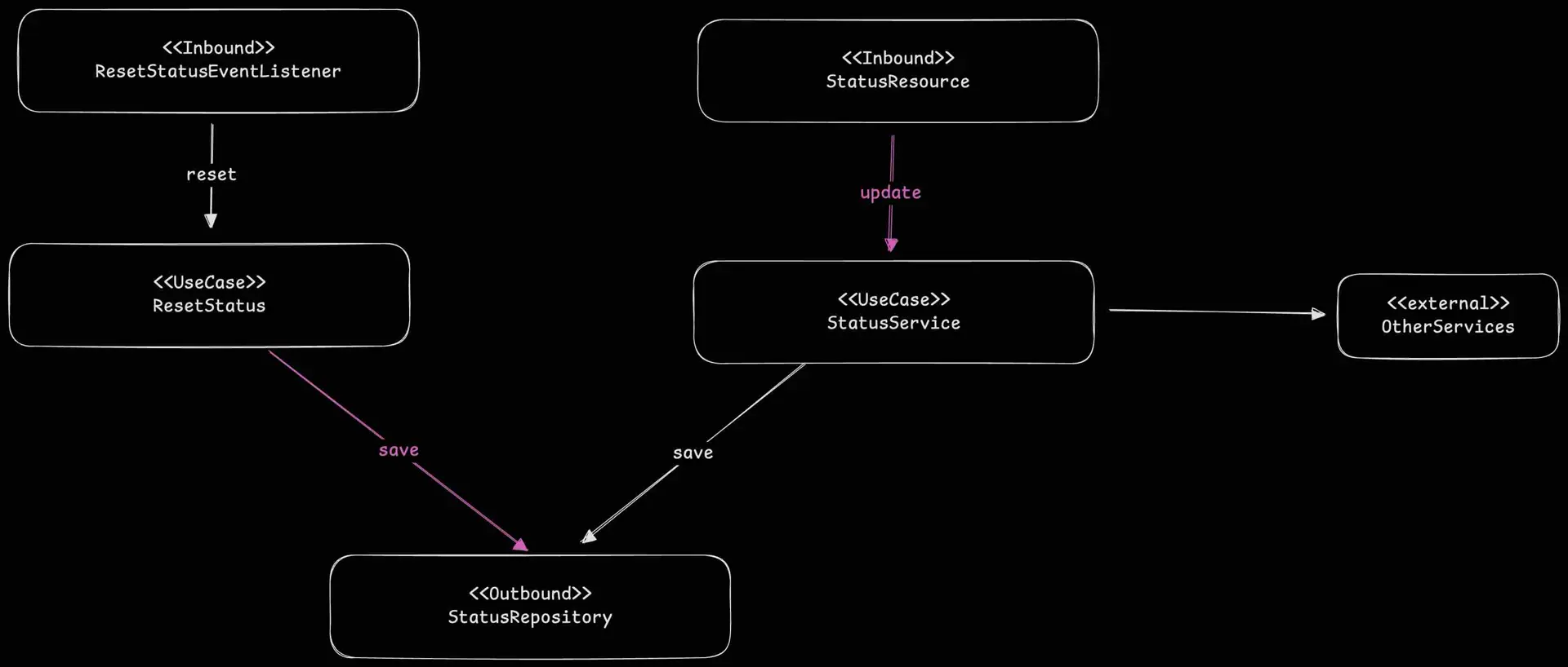 In the new structure, ResetStatus should interact directly with its required Outbound Port (StatusRepository) to save the reset status. It should not be coupled to another use case like StatusService.