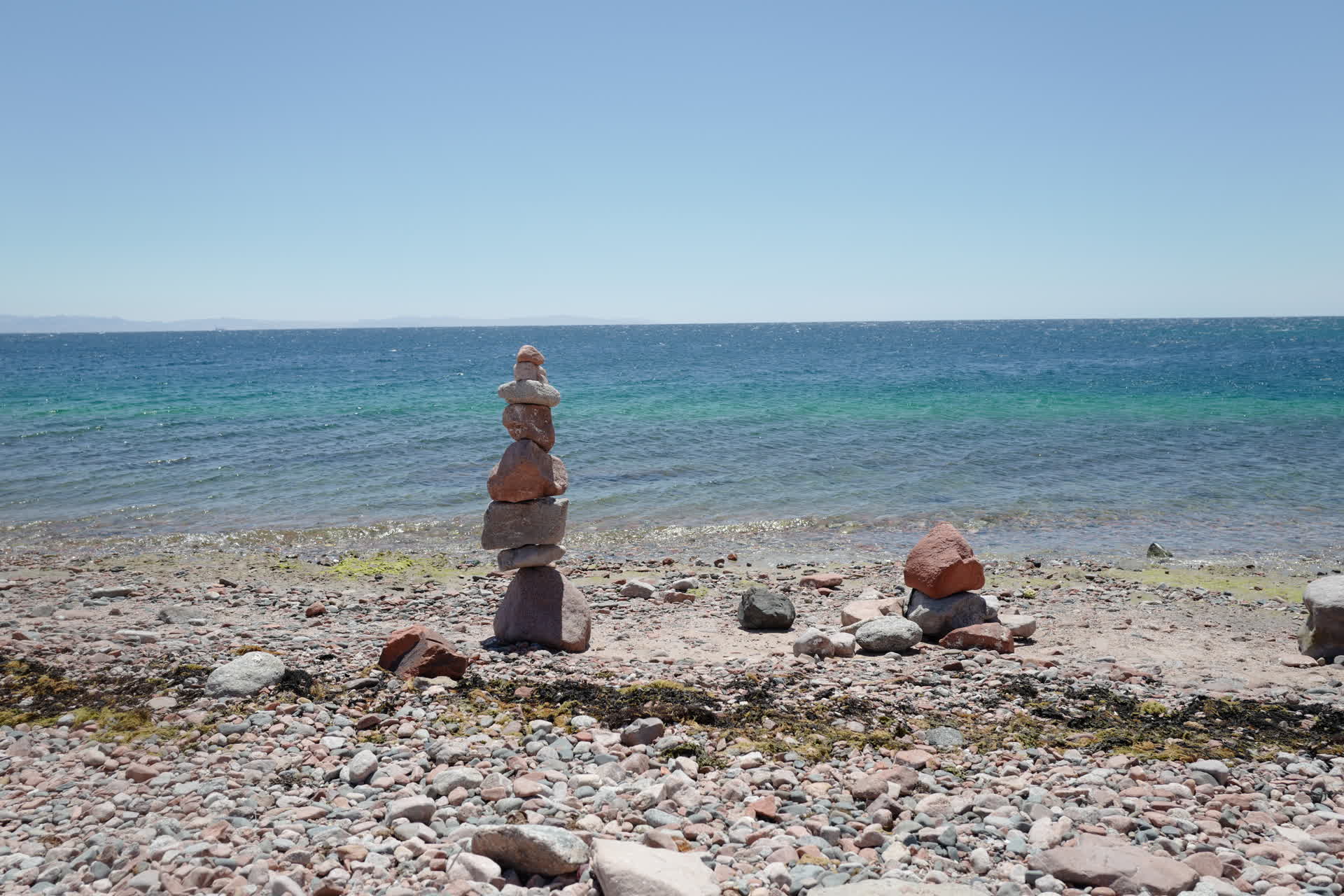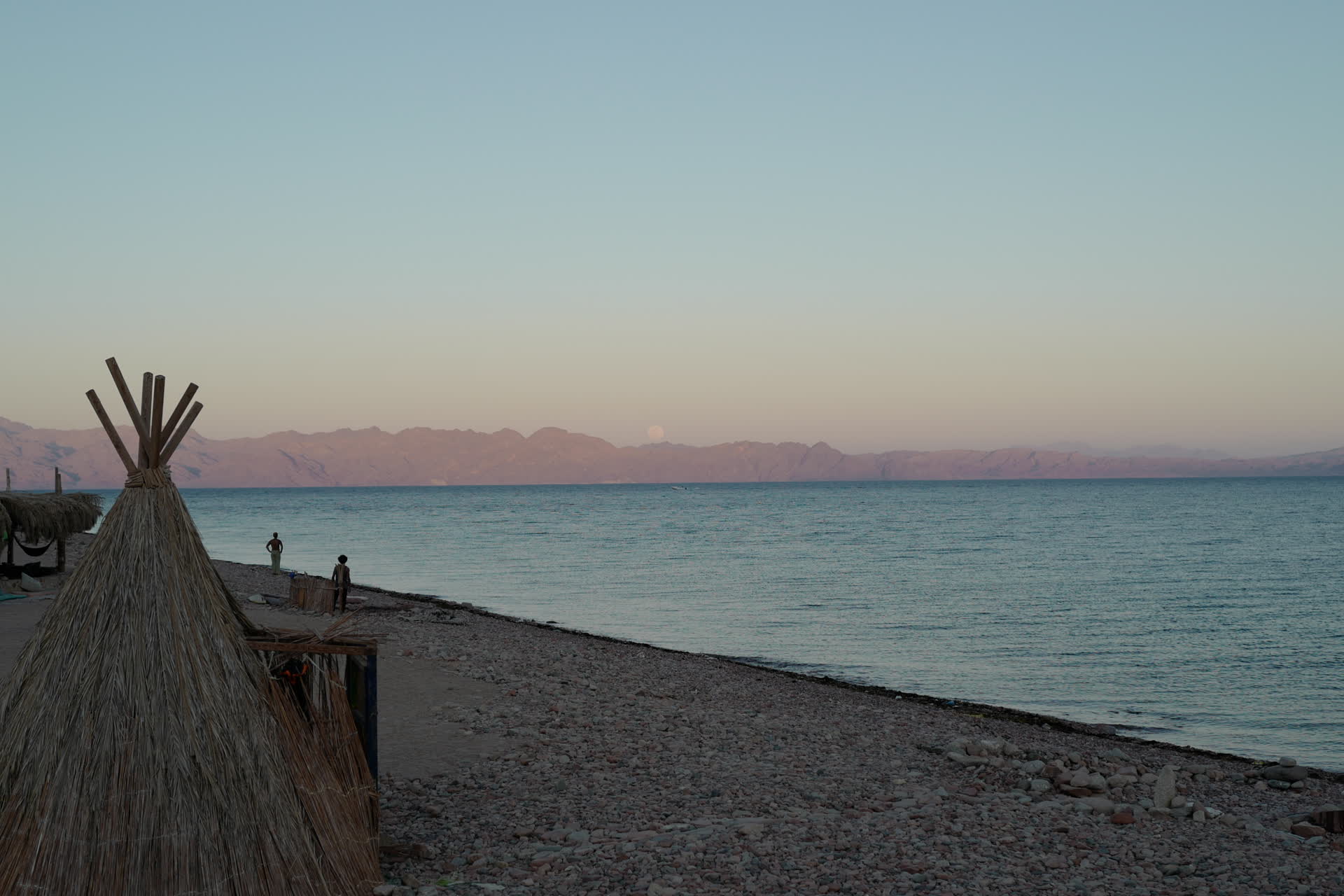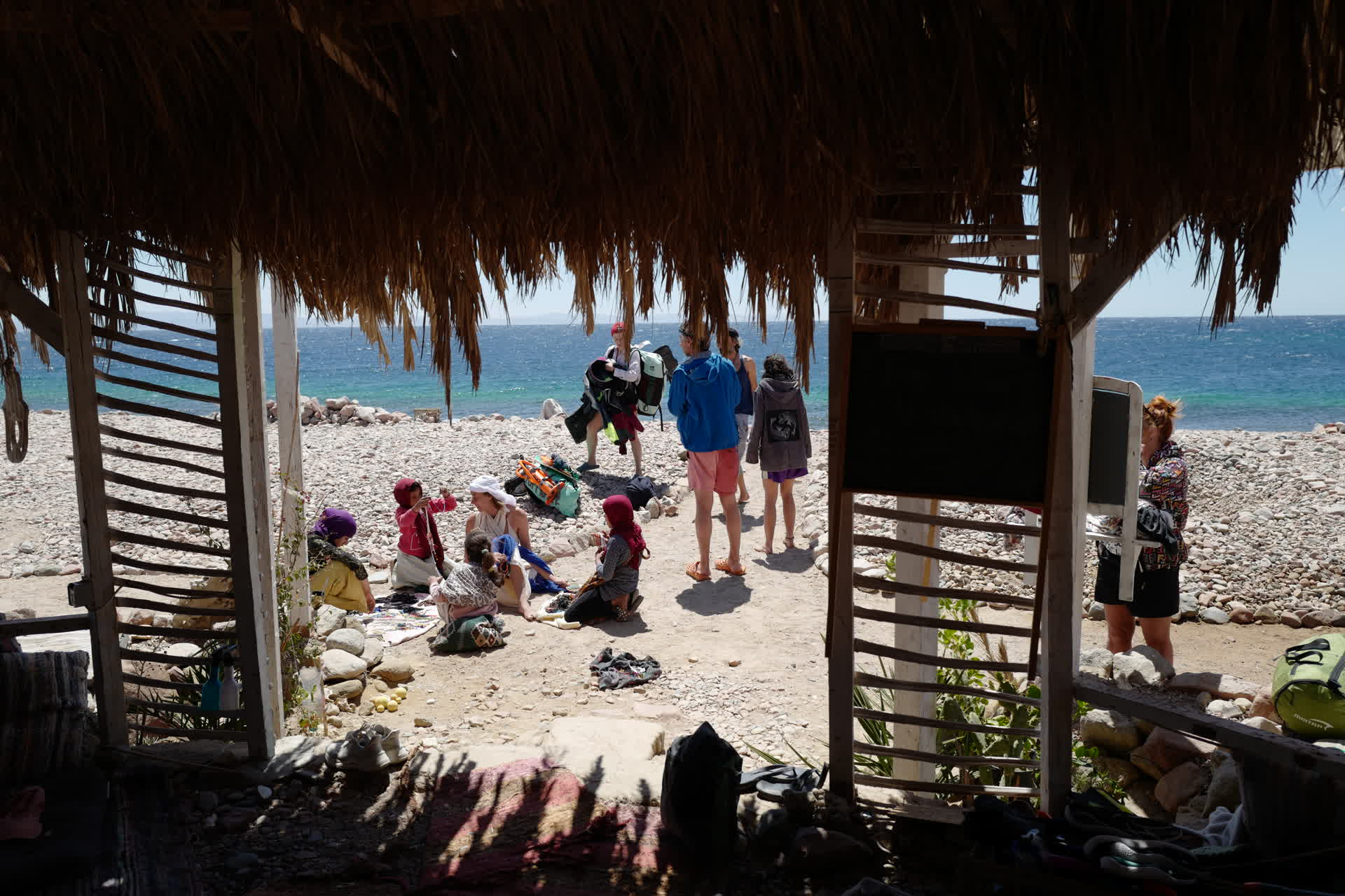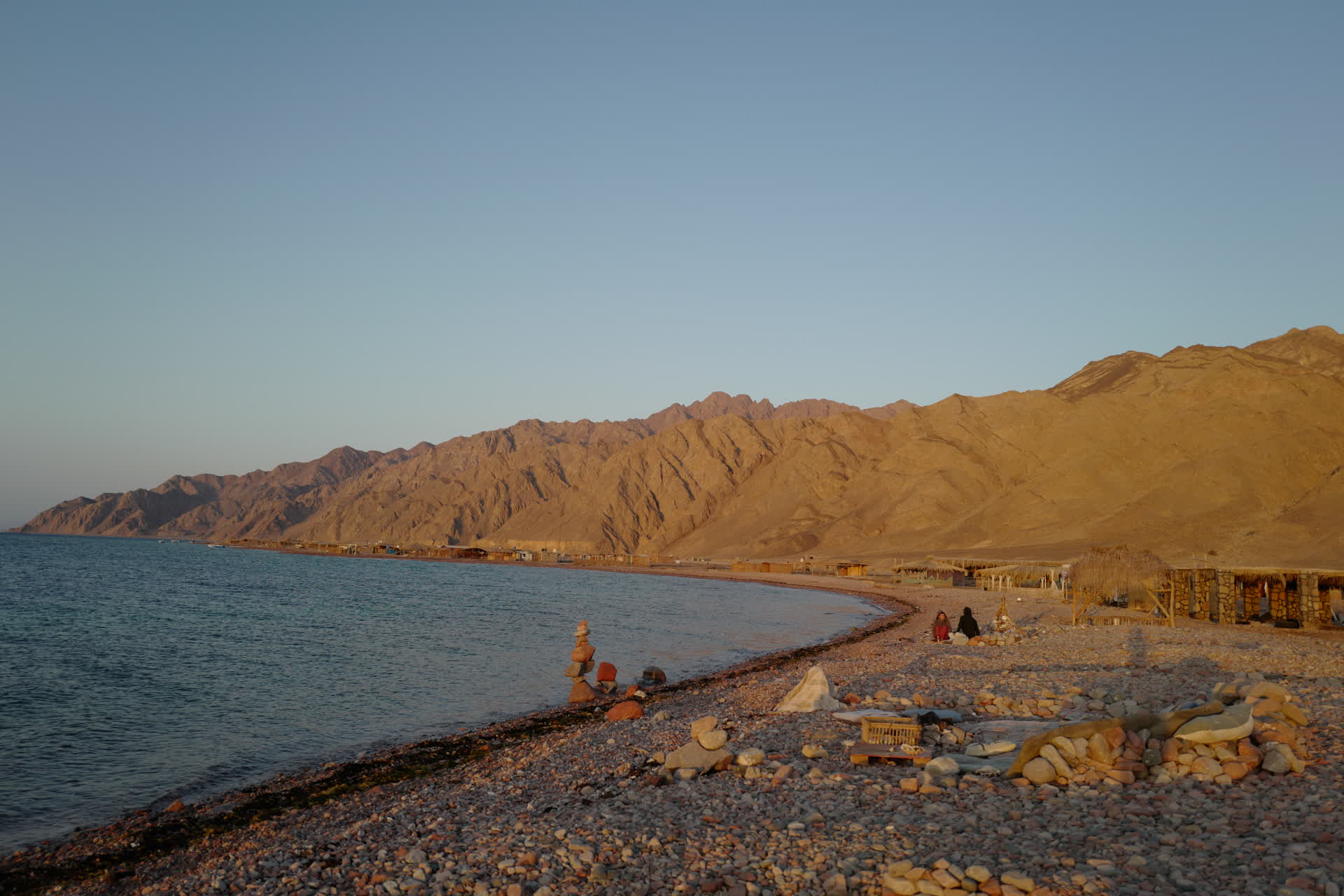 Stepping off the boat, our feet landed on a pebble beach. Carefully stacked stones nearby marked the docking spot. This was a vast coastal plain. North of Dahab, the mountains meet the sea, and any paths are only wide enough for hiking. Thus, Abu Galum, as the first plain we encountered, felt exceptionally precious. Looking around, all we could see were huts of various sizes—the only shelters available for human existence. The huts were backed by towering mountains and rocks, and though they faced the sea, the scene was far from idyllic.