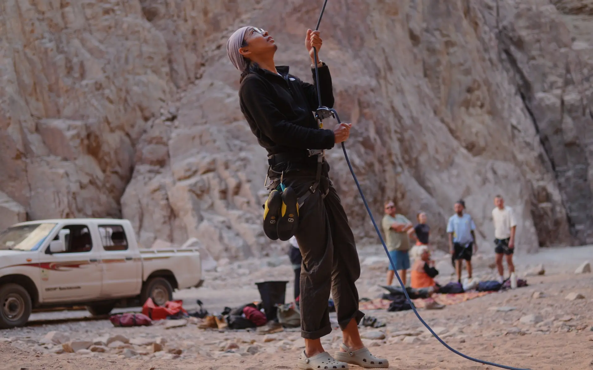 Donning the gear, I approach the rock face and wait until the moment before climbing to put on my climbing shoes. While the rock will not destroy the shoes, the fine grit and gravel will. They are hard and sharp, and they quickly score the rubber soles with mottled patterns. After tying the knot in the rope Mo just lowered from above, and mutually checking that the safety settings for both climber and belayer are correct, the climb can finally begin.