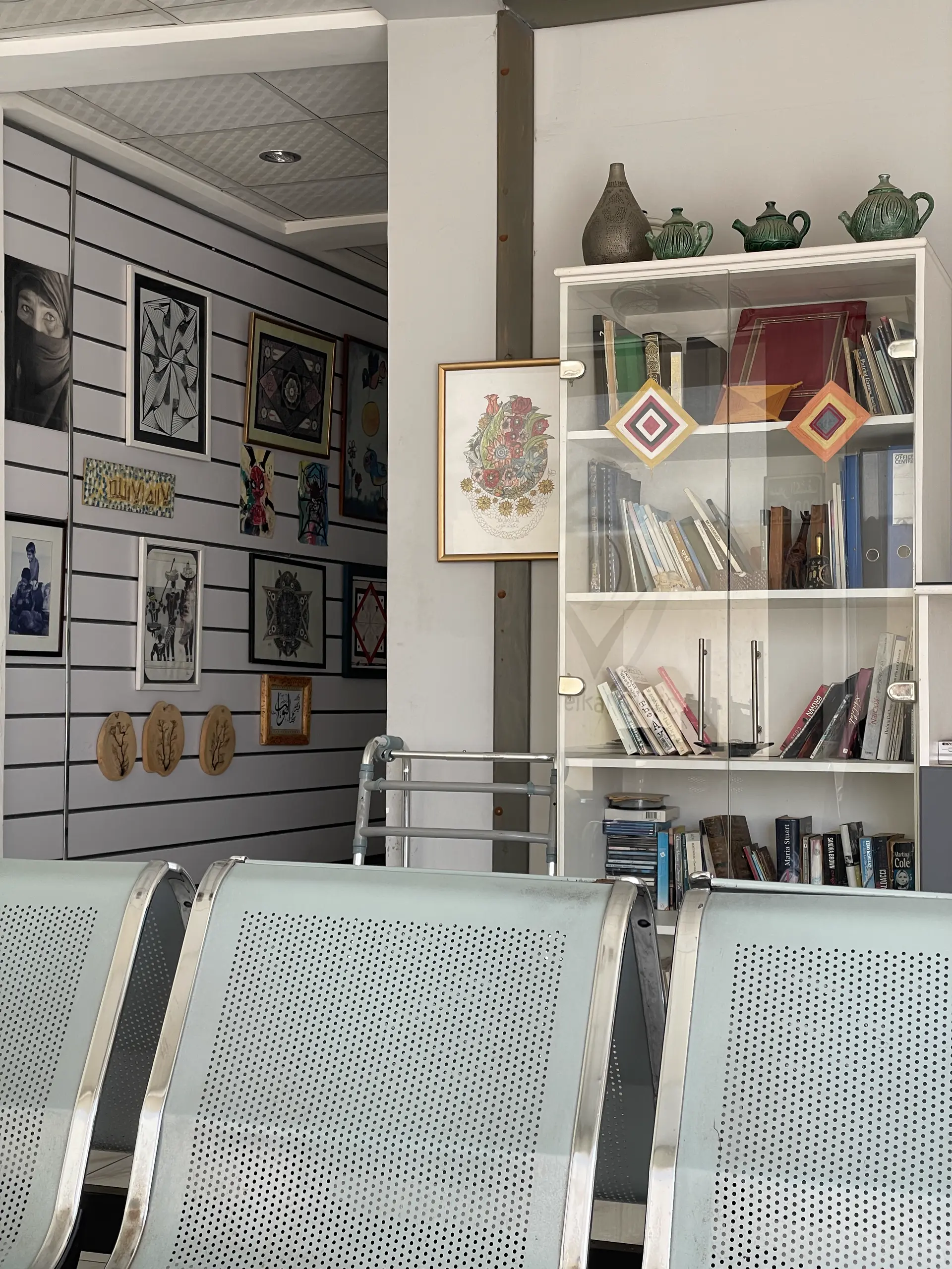 When it was time for the clinic to open, an elderly man appeared in the room wearing a yellow robe and a tan vest. He mopped the floor and opened the door before picking up the small piece of paper that had been held down by the stone. I followed the others into the waiting room which was a small space with standard steel hospital chairs and children’s drawings of the ocean on the walls. There were tattered comic books on the tables and some art pieces on the far walls including Arabic calligraphy and depictions of Islamic women’s eyes.