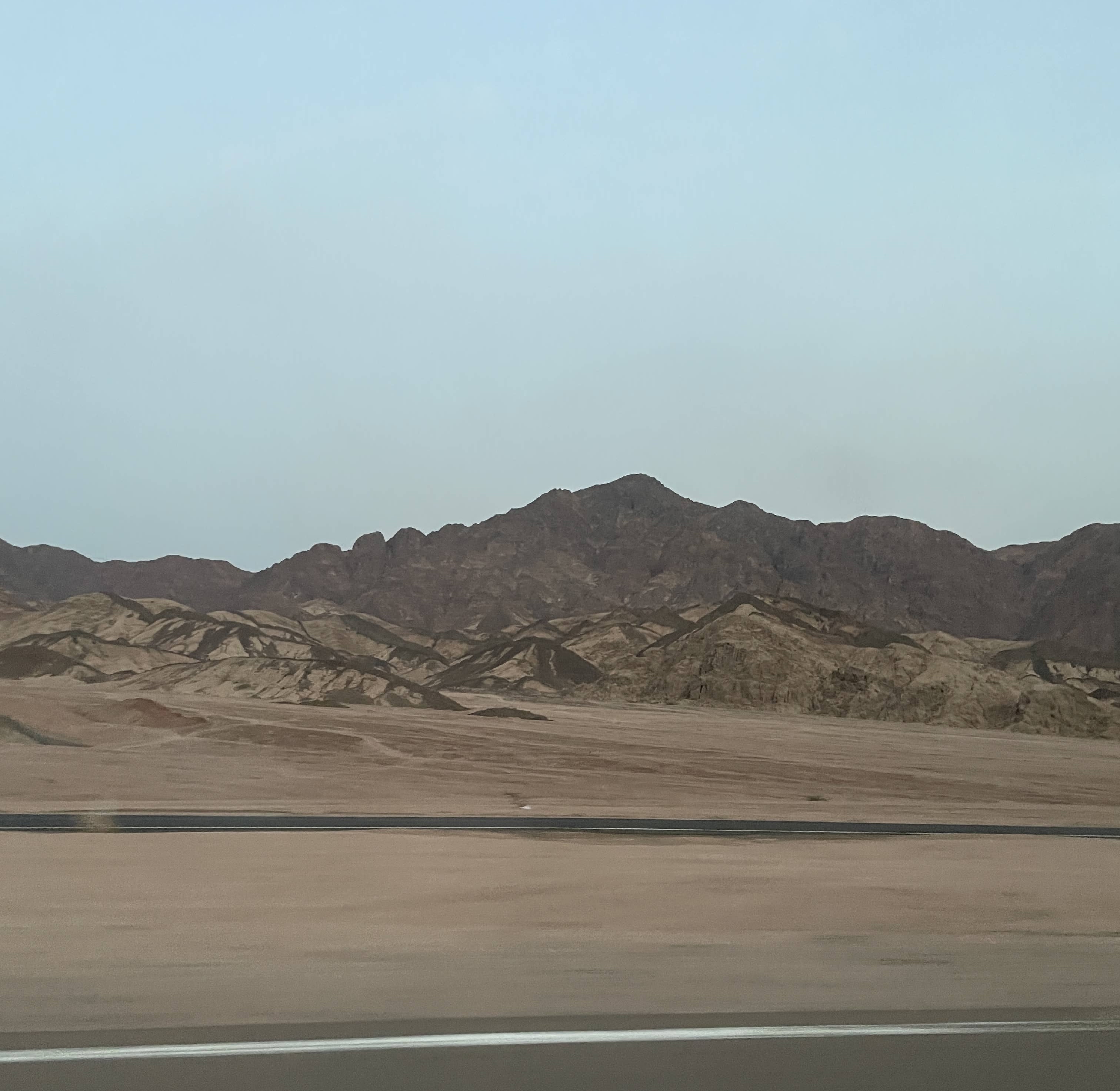 迷迷糊糊不知过了多久,天空逐渐被点亮,睁开眼睛就已看到我们早已被群山环抱。到处是荒漠,没有一点植被,远处的山非常裸露和突兀。这是荒漠的日常景象,但对习惯了高楼和青山的我们来说却特别新鲜。坐在后排,我们彼此相视一笑,眼睛反射出凌晨的微光,诉说看到山峦异景的好奇和兴奋。