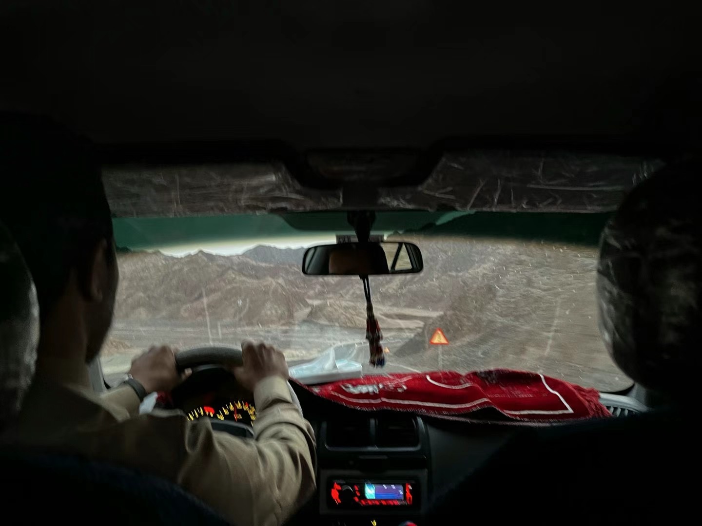 司机走到一辆小车前,示意这就是我们要坐的车。坐进车内,古朴的装潢让我想到了北京 90 年代的出租车。前挡风玻璃下铺着红色绒毯,上面点缀着黄色碎花。车上很多部件都铺着透明塑料纸,也不知道是从未拆封,还是说为防灰尘而特地罩上去的。我坐在后排左侧,白色胶带缠着的车门扶手令我印象深刻,以至于我下次乘车是靠它才辨认出这是同一辆车。后挡风玻璃盖着一层黑色塑料网,我想作用应该和前面的红毯差不多,都是为了当车辆在沙漠太阳中暴晒时,尽量给车内降降温。